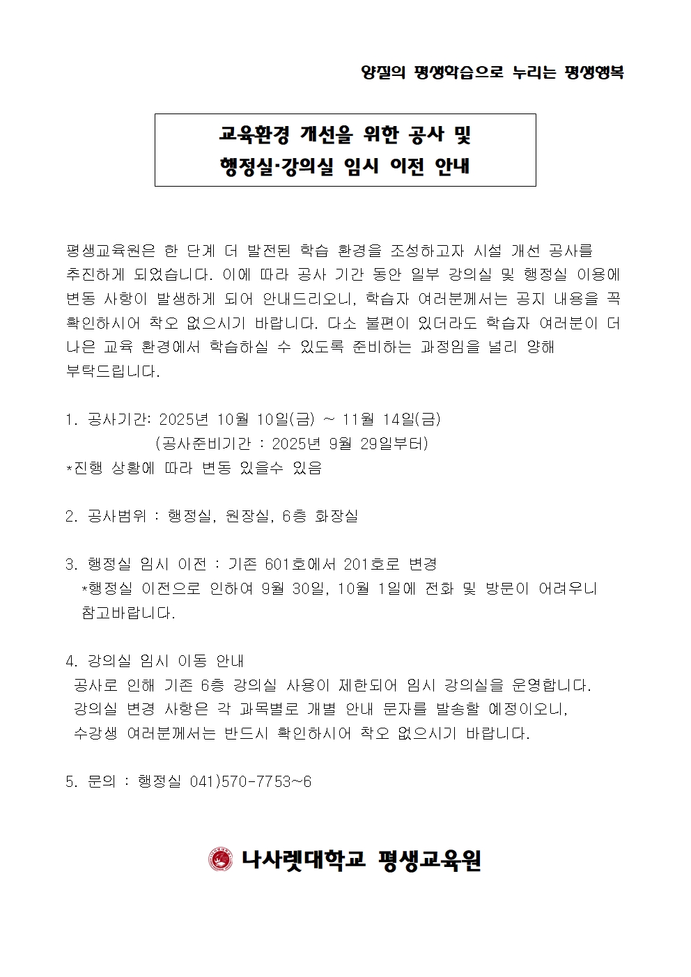 교육환경 개선을 위한 공사 및 행정실, 강의실 임시 이동 안내