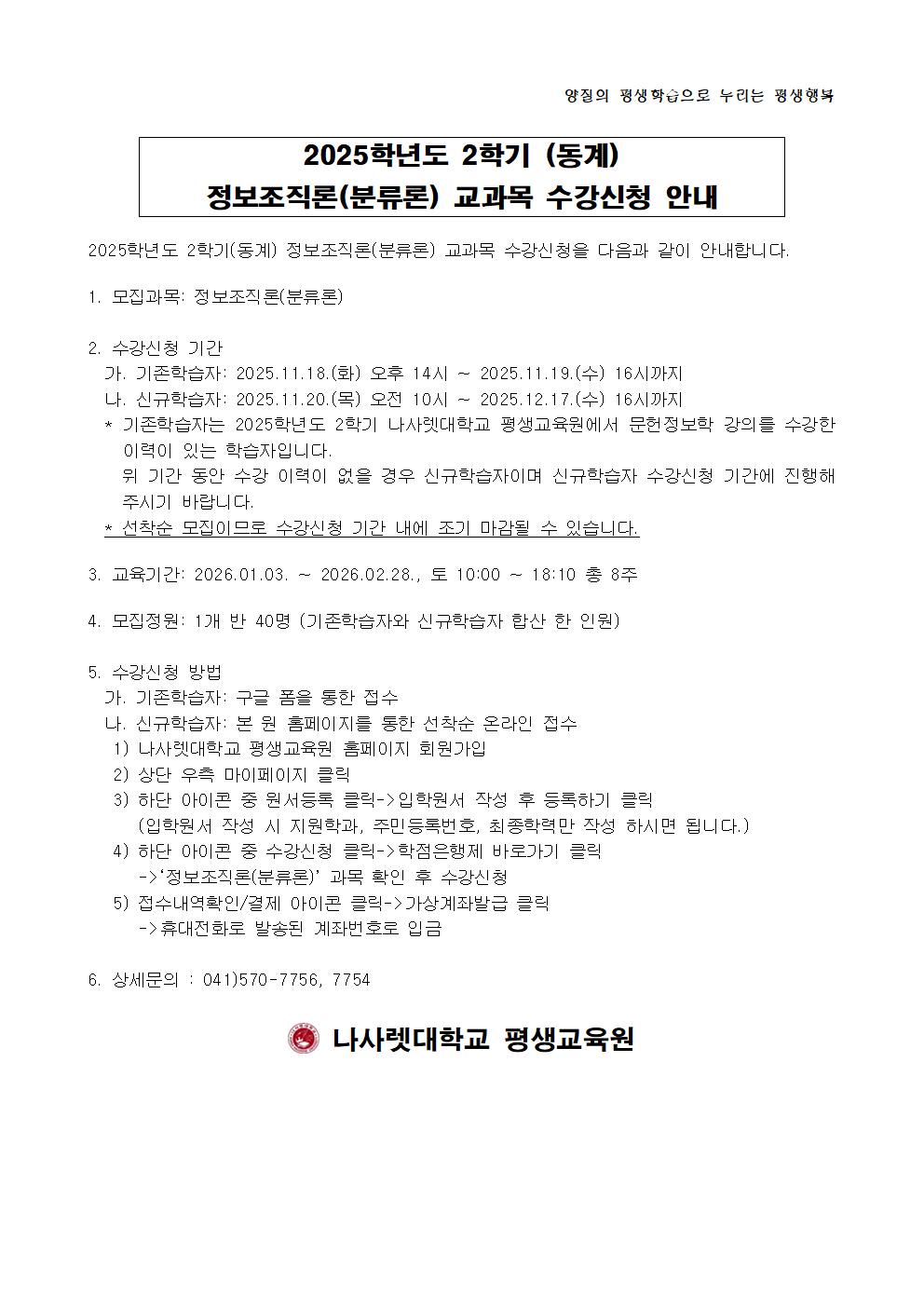 2025학년도 2학기(동계) 정보조직론(분류론) 학습자 모집 안내