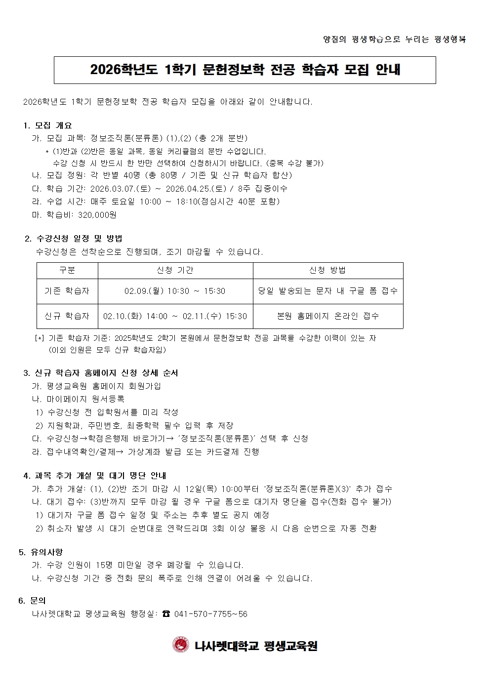 2026학년도 1학기 문헌정보학 전공 학습자 모집 안내