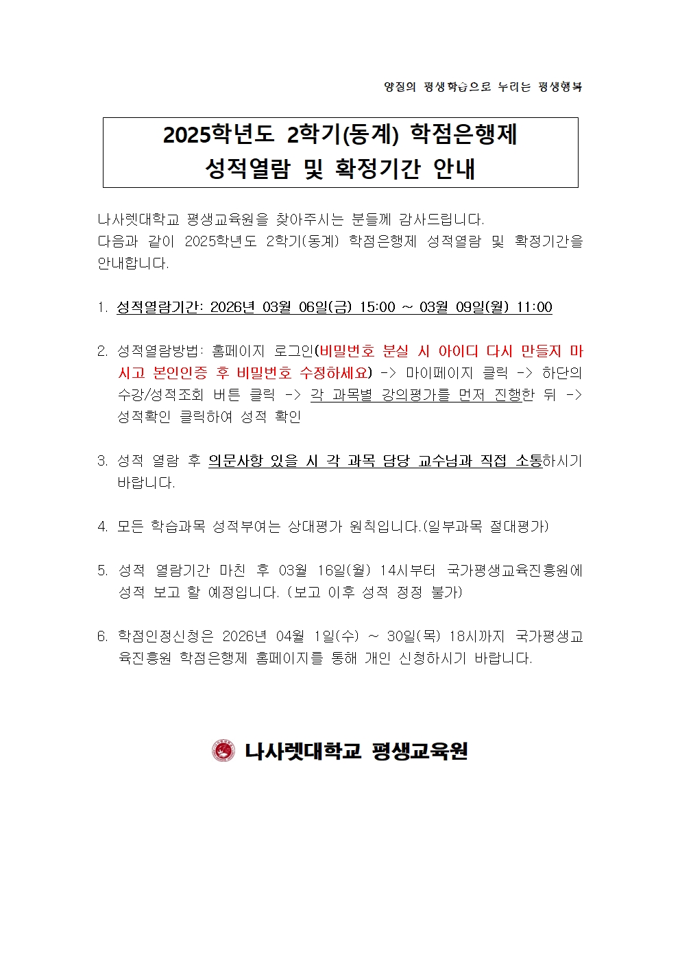 2025학년도 2학기(동계) 학점은행제 성적열람 및 확정기간 안내