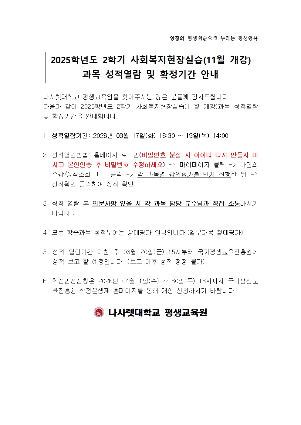 2025학년도 2학기 사회복지현장실습(11월 개강) 학점은행제 성적열람 및 확정기간 안내